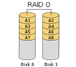 RAID 0 (Stripe) moves data across multiple disks in a way that gives improved speed at any given instant. This configuration requires a minimum of two disks but if one disk fails, however, all of the data on the array will be lost, as there is no redundancy.