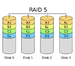 RAID 5 is a striped set with parity. This level incorporates the benefit of increased speed and redundancy allowing for a single drive failure. Upon drive failure, any subsequent reads / writes can be calculated from the distributed parity otherwise known as “running in redundant mode” and will result in reduced performance of the entire set until the failed drive has been replaced and rebuilt. The array will have data loss in the event of a second drive failure and is vulnerable until the data that was on the failed drive is rebuilt onto a replacement drive. This array type requires a minimum of three disks and is still the most common array type in Servers and RAID devices used today.